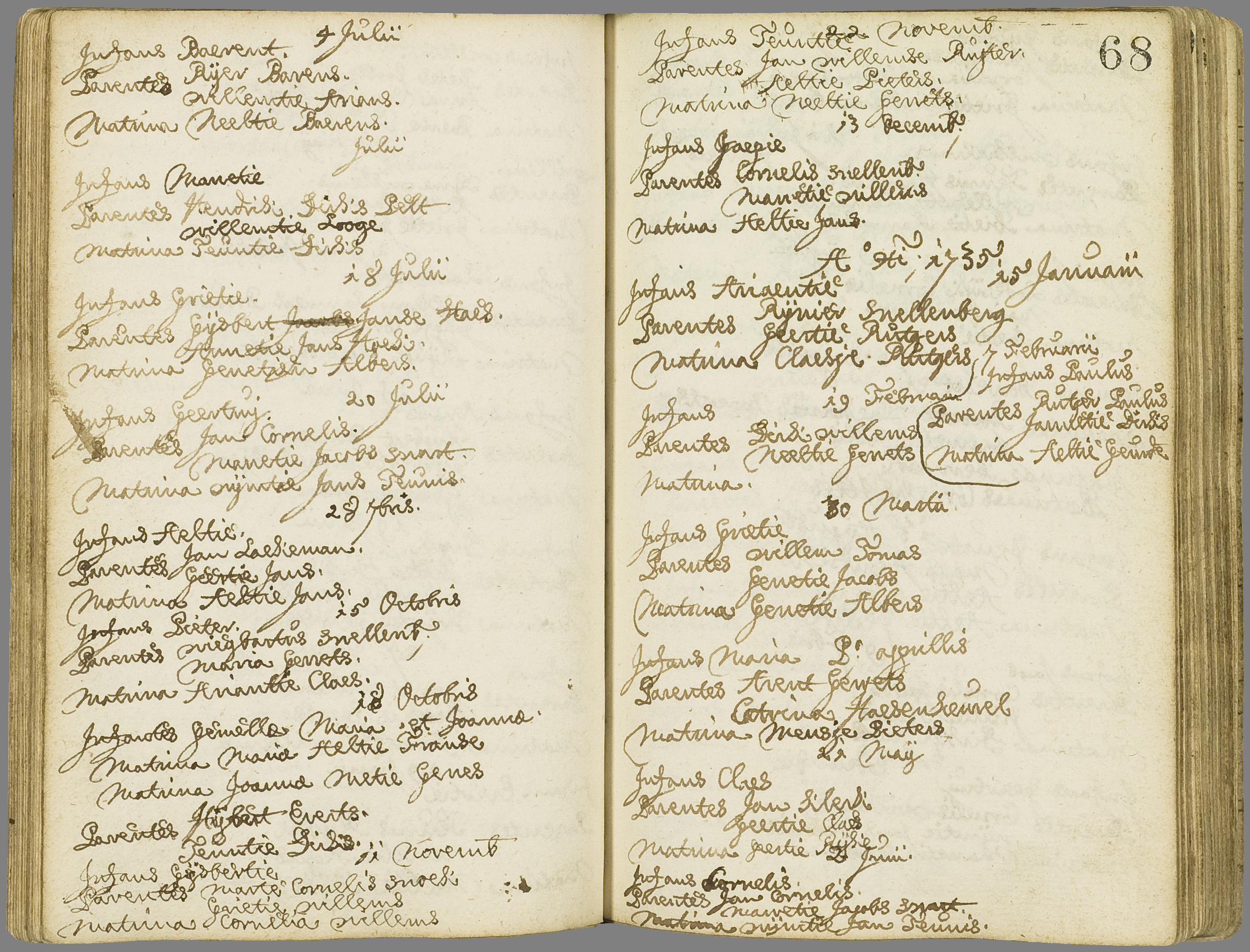 DTB_Archief_Eemland_1010.545 Eemnes, Utrecht RK begraven 1759-1788 dopen 1692-1782 trouwen 1709-1782 Erfgoedstuk Ga naar de scans Doopinschrijving Doopinschrijving Gijsbertie Snoek, 11-11-1734 Doopdatum: 11-11-1734 Akteplaats: Eemnes, Utrecht Dopeling: Gijsbertie Snoek Voornaam: Gijsbertie Achternaam: Snoek Geslacht: v Aktedatum: 11-11-1734 Vader: Marten Snoek Voornaam: Marten Patroniem: Cornelis Achternaam: Snoek Moeder: Grietie Willems Voornaam: Grietie Achternaam: Willems Getuige 1: Cornelia Willems Voornaam: Cornelia Achternaam: Willems Gezindte: Rooms-katholiek Toegangsnummer: DTB_Archief_Eemland_1010 - Inventarisnummer: 545 Paginanummer: 68 Organisatie: Het Utrechts Archief |