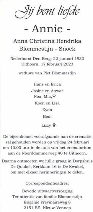 Anna Christina Hendrika Snoek overlijden
